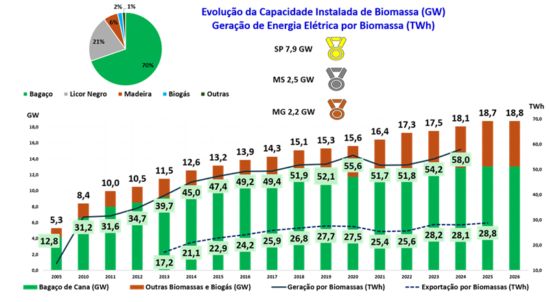 "Evolução da Capacidade Instalada de Biomassas Biomassas: 18,8 GW Fontes: DataCOGEN, ANEEL, CCEE, EPE"