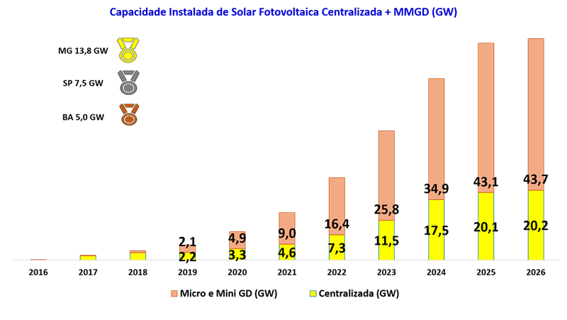 "Evolução da Capacidade Instalada de Solar Fotovoltaica Solar Fotovoltaica: 63,9 GW Fontes: DataCOGEN, ANEEL, CCEE, EPE"