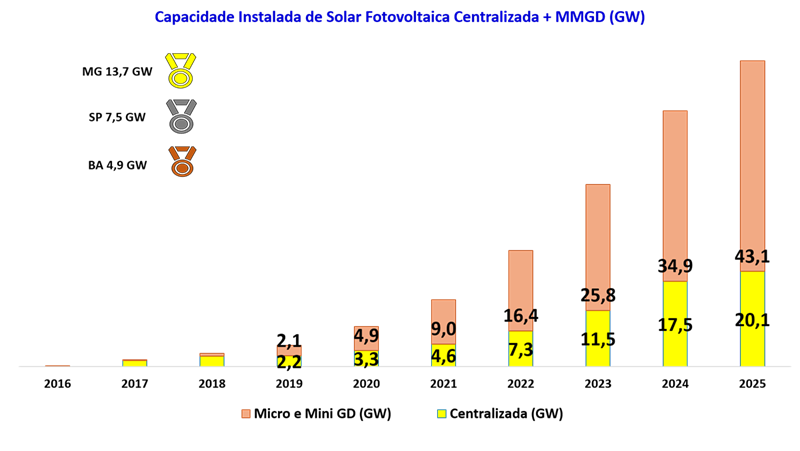 "Evolução da Capacidade Instalada de Solar Fotovoltaica Solar Fotovoltaica: 63,2 GW Fontes: DataCOGEN, ANEEL, CCEE, EPE"